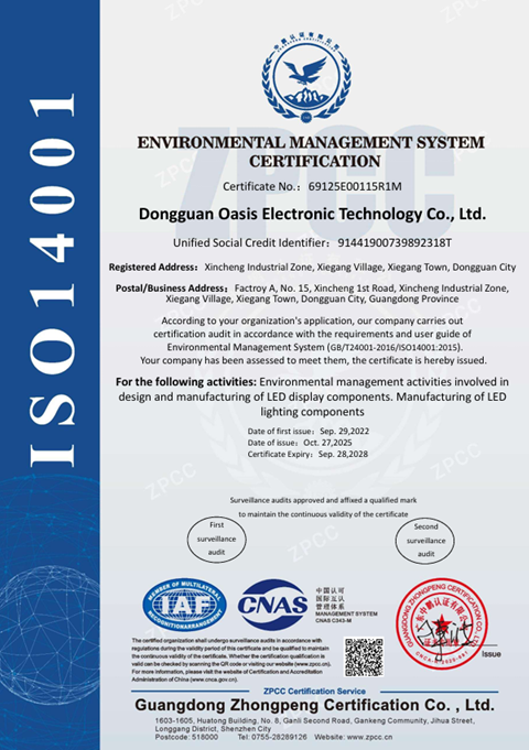 Oasistek has received numerous international quality certifications including ISO9001:2015 and ISO14001:2015, and has successfully met the quality and reliability demands of numerous leading global manufacturers.
